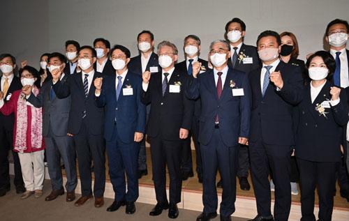 이재명(앞줄 오른쪽 네번째) 경기도지사와 조정식(다섯번째) 의원, 이종석(세번째) 전 통일부장관 등 민주평화광장 발기인들이 12일 오전 서울 마포구 서울미디어대학원대학교 상암연구센터에서 열린 민주평화광장 출범식에서 필승을 외치며 기념촬영을 하고 있다.