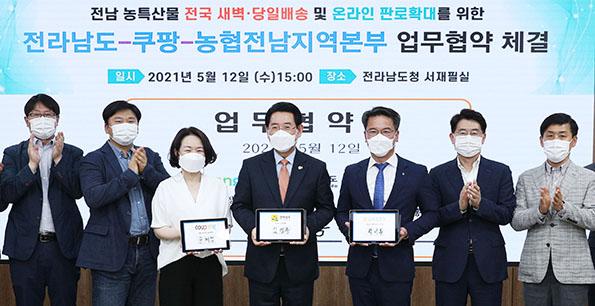 전남도는 12일 도청 정약용실에서 김영록 도지사, 윤혜영 쿠팡 리테일 부사장, 박서홍 농협중앙회전남지역본부장 등이 참석한 가운데 쿠팡, 농협중앙회전남지역본부와 전남 농축수산물 소비 촉진 및 온라인 판로 확대 업무협약을 했다.
