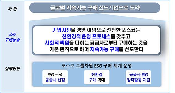 포스코는 경영이념인 기업시민의 5대 브랜드 중 ‘Together With POSCO’(동반성장)와 ‘Green With POSCO’(탄소중립)에 기반해, ‘친환경적이고 사회적 책임을 다하는 공급사로부터 구매하는 것을 기본 원칙으로 하여 지속가능한 구매를 선도한다’는 구매방침 하에 그룹 차원의 ‘포스코형 ESG 구매 체계’를 구축했다.