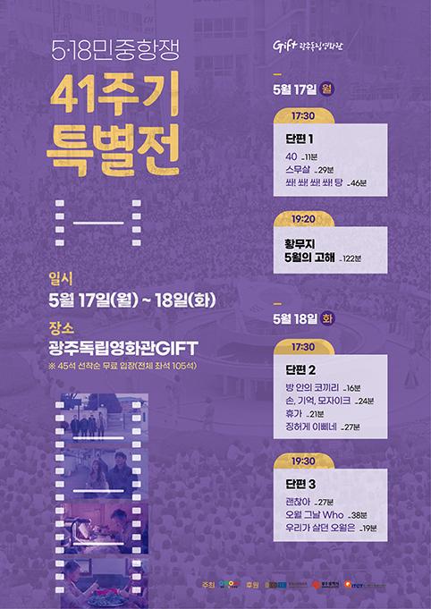 17일부터 18일까지 이틀동안 진행되는 ‘5·18 민중항쟁 41주기 특별전’은 영화를 통해 5·18의 역사적 의의를 되새기고 현재의 우리를 돌아보자는 취지로 기획되었다.