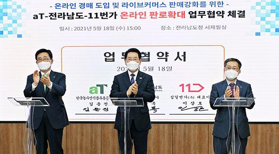 aT는 18일 전남도청 서재필실에서 농축수산물 온라인 판로 확대를 위해 전남도, 십일번가㈜와 3자 간 업무협약(MOU)을 체결했다고 밝혔다.