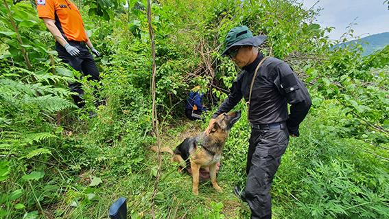 2일차인 지난 23일 정오 12시경 순천소방서 산악구조대 인명구조견‘용맹’이 야산 중턱에서 숨진 상태의 실종자 A씨(50대 추정)를 발견했다.
