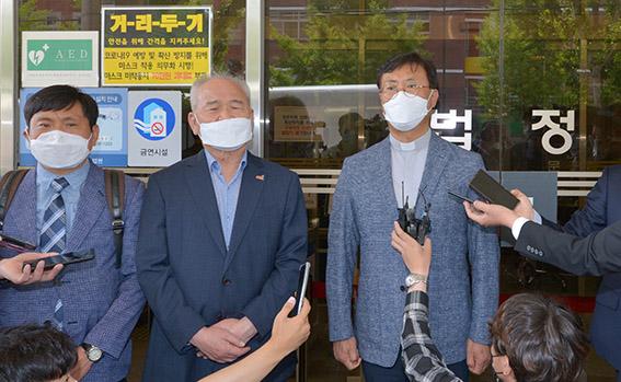 5·18 항쟁 당시 헬기 사격을 증언한 고(故) 조비오 신부의 명예를 훼손한 혐의를 받는 전두환씨의 항소심 재판이 열린 24일 오후 광주 동구 광주지법에서 고 조 신부의 조카이자 고소인인 조영대 신부가 입장을 밝히고 있다. 2021.05.24.
