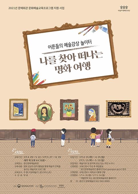 광주 광산구(구청장 김삼호)가 광산문화예술회관에서 진행하는 문화예술교육프로그램 ‘어른들의 예술감상 놀이터-나를 찾아 떠나는 명화여행’ 2기 수강생을 모집한다.