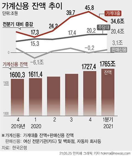 한국은행이 25일 발표한 '2021년 1분기중 가계신용'에 따르면 올 1분기 말 가계신용 잔액은 전년동기 대비 153조6000억원 증가한 1765조원으로 한은이 통계를 작성하기 시작한 2003년 이후 가장 많았다. 가계빚 증가 규모도 2003년 이후 가장 큰 폭으로 늘었다. 전분기 대비로는 37조6000억원(2.2%) 늘어 지난해 4분기(45조5000억원) 보다는 축소됐으나 1분기 증가액 기준으로 최대치를 기록했다. 가계신용은 금융권 가계대출 잔액에 카드사와 백화점 등의 판매신용 잔액을 더한 액수다.