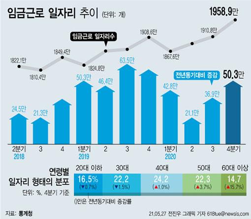 통계청이 27일 발표한 '2020년 4분기 임금근로 일자리동향'에 따르면 지난해 4분기(11월 기준) 임금근로 일자리는 1958만9000개로 지난해 동기 대비 50만3000개 증가했다. 임금 일자리는 2017년 통계 작성 이래 가장 많았으며 증가 폭은 2019년 4분기(59만2000개) 이후 1년 만에 가장 컸다.