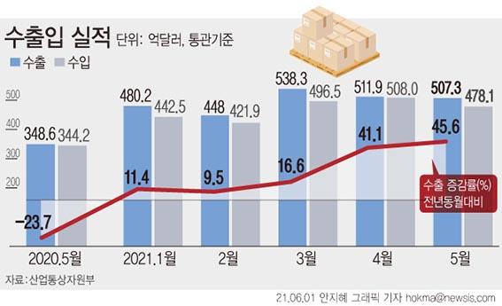 우리 수출은 지난해 11월(3.9%)부터 12월(12.4%), 올해 1월(11.4%), 2월(9.5%), 3월(16.6%), 4월(41.1%)까지 상승세를 이어왔다. 산업부 관계자는 "5월 수출은 32년 만에 최대 폭으로 상승했다"며 "2개월 연속 40%대 성장은 역사상 최초"라고 말했다.