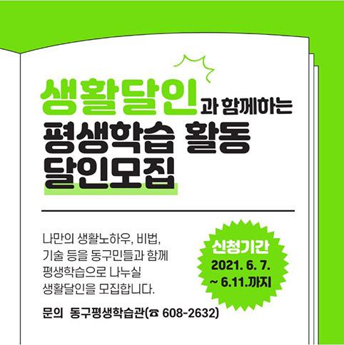 동구(청장 임택)는 지역 생활달인을 발굴해 달인의 생활 노하우를 지역민들에게 전수하고 배워보는 평생교육 프로그램 ‘동구 생활의 달인’ 분야별 경력자를 모집한다고 밝혔다.