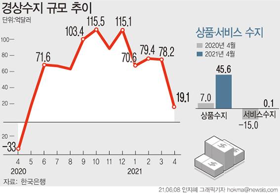 4월 경상수지는 외국인 투자자에 대한 배당금 지급 등의 영향으로 2019년과 2020년 적자를 보여 왔다. 4월 경상수지가 흑자를 기록한 것은 2018년 4월(14억9000만달러) 이후 3년 만이다. 이는 자동차, 반도체 등의 수출 호조와 해상화물 운송수입 증가 등의 영향이다.
