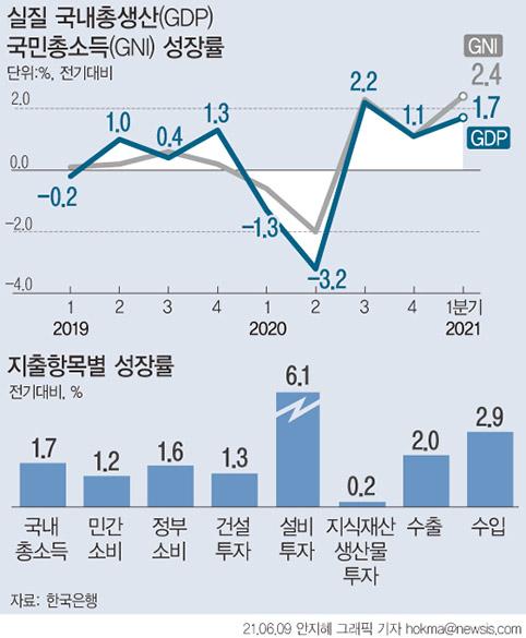 1분기 경제성장률이 1.7%로 속보치보다 0.1%포인트 상향되면서 코로나19 이전 수준을 완전히 회복했다. 실질 국민총소득(GNI)은 473조8000억원으로 전기대비 2.4% 증가했다.