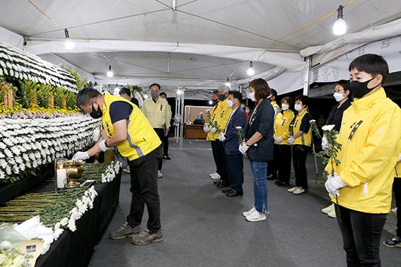 세월호 유족 10여 명은 헌화·분향하며 이번 붕괴 사고로 희생된 9명의 넋을 기렸다. 영정사진을 보며 눈시울을 붉히기도 했다.