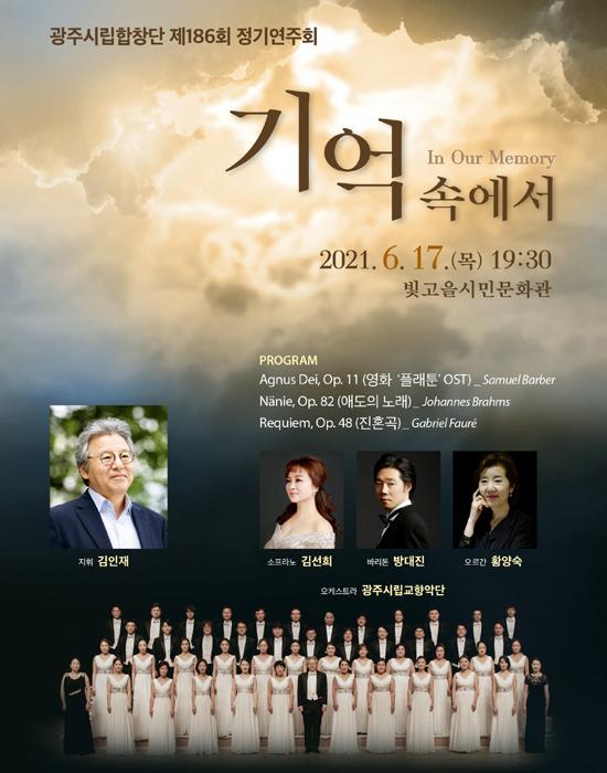 광주시립합창단은 17일 오후 7시30분 빛고을시민문화관에서 제186회 정기연주회 ‘기억 속에서(In Our Memory)’를 무대에 올린다고 10일 밝혔다.