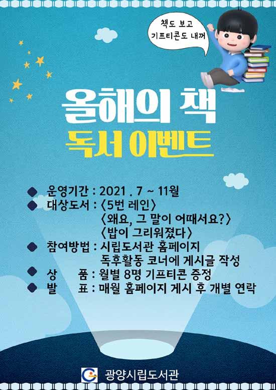 독서이벤트는 광양시민이면 누구나 참여할 수 있으며, 시립도서관은 매월 응모자 중 추첨을 통해 선정한 시민에게 기프티콘을 제공한다. 자세한 사항은 광양시립도서관 홈페이지(lib.gwangyang.go.kr)에서 확인하거나, 도서관지원팀(061-797-3853)에 문의하면 된다.