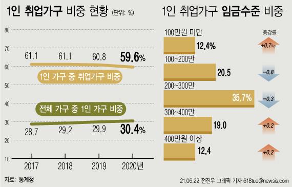 지난해 나홀로 가구 비중이 처음으로 30%를 돌파했다. 10가구 중 3가구는 혼자 사는 셈이다. 1인 가구 취업자의 고용률은 코로나19 영향으로 통계 작성 이래 처음으로 60%를 밑돌았다.