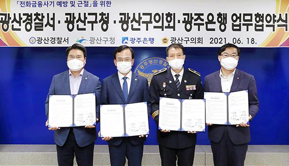 광주은행과 광산구청, 광산경찰서, 광산구의회는 최근 광산경찰서에서 이광호 부행장과 김삼호 청장, 김광남 서장, 박현석 부의장 등이 참석한 가운데 금융사기 피해 예방을 위한 업무협약을 체결했다. (사진=광주은행 제공), 2021.06.23.