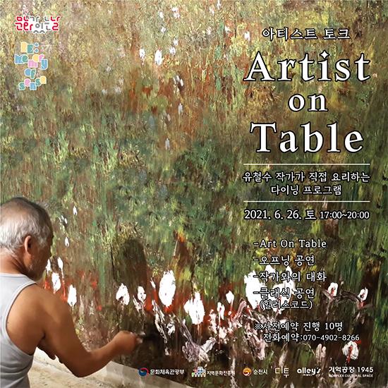 ‘Art On Table’은 유 작가가 직접 요리를 하고 관객들과 음식을 매개로 소통하는 다이닝 프로그램으로 오프닝 공연(문화예술협동조합 힐러스코드 연주팀 앙상블힐러스)과 토크 콘서트 작가와의 대화, 클래식 공연 순으로 이루어진다.