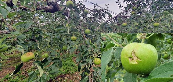 지난 22일 전남 동부권에 강한 소나기성 우박이 내리면서 고추, 사과, 옥수수 등 농작물 피해가 발생했다. 사진은 곡성군 오곡면 미산리 사과농장 우박피해. (사진=전남도 제공) 2021.06.24