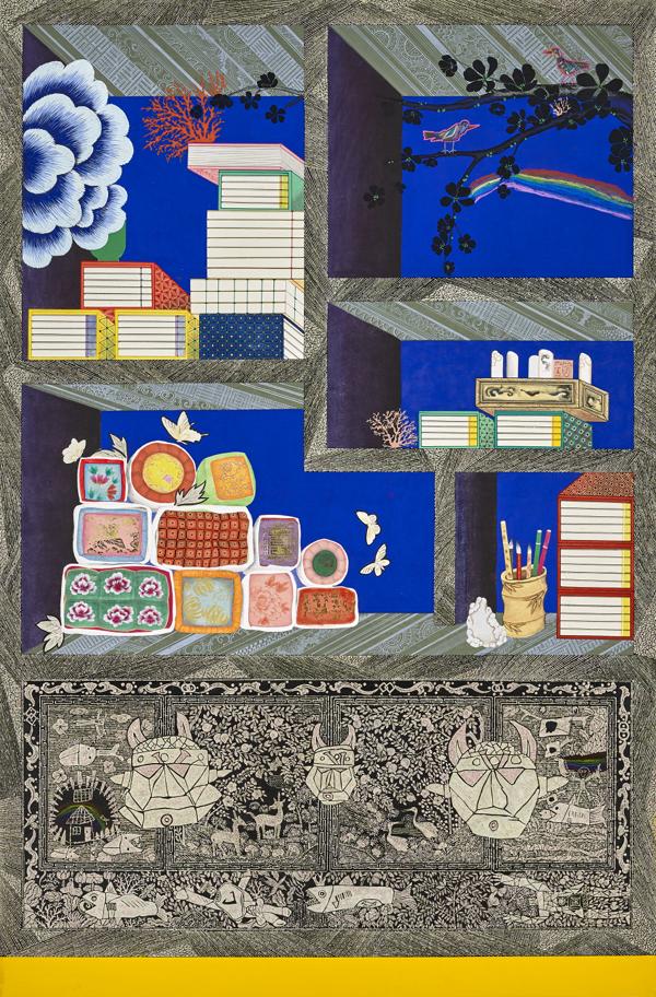 ‘컬러피아’는 전통 책가도와 오방색을 현대적으로 재해석한 작품으로 SNS에 작품사진이 공개된 이후 벌써부터 작품 및 도록 구입 문의가 쇄도하고 있다. 문선영 작가가 어린 두 아들과 함께 콜라보한 부분도 있어서 작품마다 아이 그림을 찾는 재미도 있다.