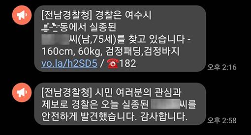 문병훈 여수경찰서장은 "실종 경보 문자메시지가 실종 아동 등을 찾는데 직접적 효과가 나타나고 있고 주민 관심도 뜨겁다"면서 "앞으로 실종 사건을 신속히 해결하는데 큰 역할을 할 것으로 기대한다"고 말했다.