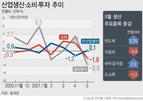 기획재정부는 "5월 산업활동은 기저 및 공급 차질·날씨·조업일 등 일시 요인에 영향을 받으며 기타 주요지표가 전월대비 다소 조정됐지만, 수출 및 심리지표 흐름, 선행지수 증가세 등을 고려하면 전반적 경기회복 흐름이 지속되고 있다"고 진단했다.