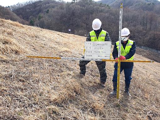 한국농어촌공사 점검반이 저수지 경사면 상태와 기울기를 조사하고 있다.(사진=농어촌공사 제공) 2021.07.01.