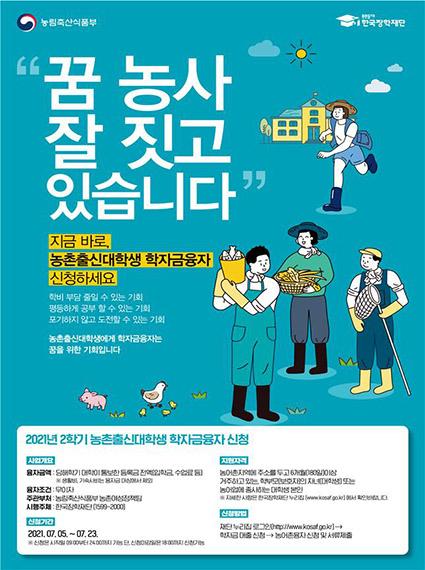 농림축산식품부는 농촌 지역 학부모의 교육비 부담을 낮추고 농촌 출신 대학생에 대한 균등한 교육 기회를 제공하기 위해 2학기 대학교 등록금 전액을 무이자로 대출해준다고 4일 밝혔다.
