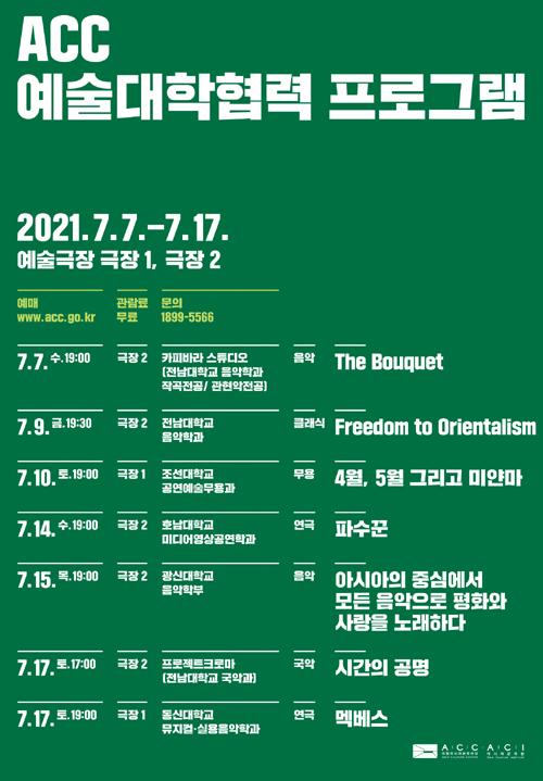 국립아시아문화전당과 아시아문화원은 ‘2021 ACC 예술대학협력 프로그램’을 7일부터 17일까지 2주동안 예술극장에서 공연예술계 대학생들의 한마당 잔치가 펼쳐진다고 밝혔다.