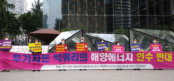광주·전남 9개 시민단체·정당으로 꾸려진 '투기자본 맥쿼리의 해양에너지 인수 저지와 도시가스 요금 인하 시민대책위'(대책위)는 6일 오전 서울 종로구 맥쿼리 사무실 앞에서 인수 저지 집회를 벌였다.