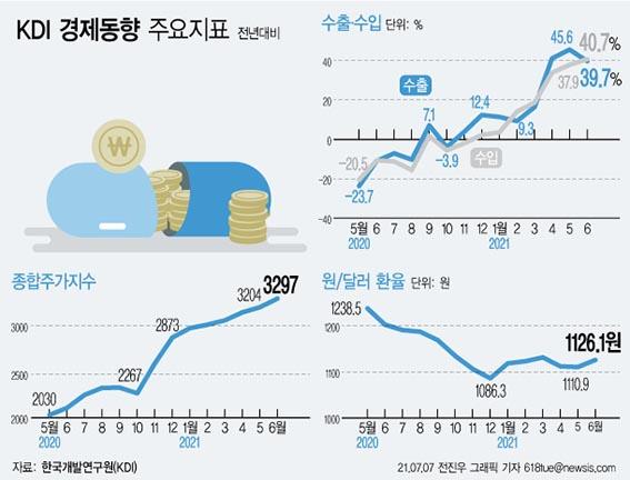 KDI는 7일 발표한 '경제동향 7월호'에서 "최근 우리 경제는 생산이 일시적으로 조정됐으나 대내외 상품 수요 증가세가 지속되며 완만한 경기 회복세는 유지되는 모습"이라며 "높은 수출 증가세와 경제 심리지표의 개선 흐름을 감안하면 경기는 완만하게 회복되고 있다"고 진단했다.