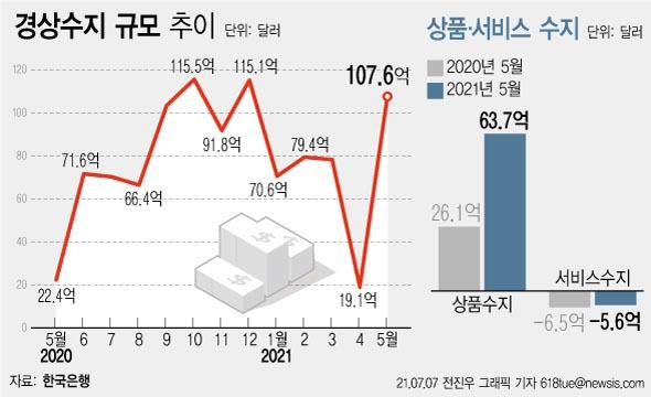 7일 한국은행이 발표한 '2021년 5월 국제수지(잠정)'에 따르면 5월 경상수지는 107억6000만달러(12조2018억원) 흑자를 냈다. 이로써 경상수지는 지난해 5월 이후 13개월째 흑자 행진을 이어갔다. 1년 전 같은 달(22억4000만달러)에 비해서는 흑자 폭이 85억2000만달러 확대됐다.