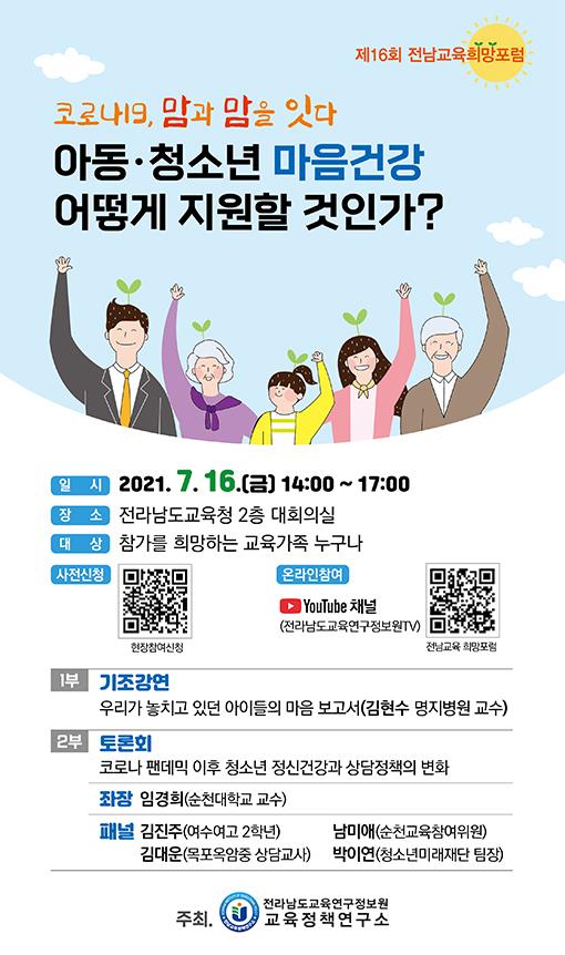 ‘제16회 전남교육 희망포럼’이 ‘코로나19, 맘과맘을 잇다 아동청소년 마음건강 어떻게 지원할 것인가?’를 주제로 16일 오후 2시 전남도교육청 2층 대회의실에서 열린다.