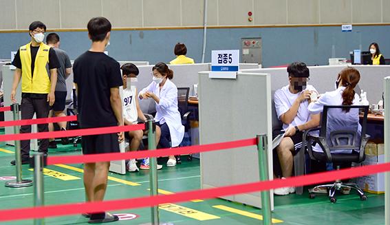 코로나19백신예방접종센터가 설치된 서구 염주종합체육관 빛고을체육관은 간편한 복장을 한 서구의 한 고교 수험생들이 길게 줄서 있었다.
