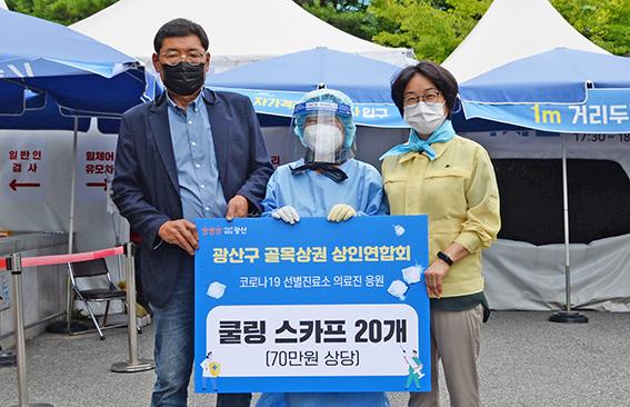 광산구 골목상권 상인연합회가 지난 23일 광산구 선별진료소를 찾아 폭염과 사투를 벌이고 있는 의료진을 응원하기 위해 ‘쿨링 스카프’ 20개(70만 원 상당)를 후원했다. /이동기 기자