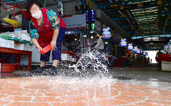 폭염이 지속되고 있는 10일 오후 광주 동구 남광주시장에서 한 생선가게 상인이 손님 통행로 열을 식히기 위해 물을 뿌리고 있다. 2021.08.10.
