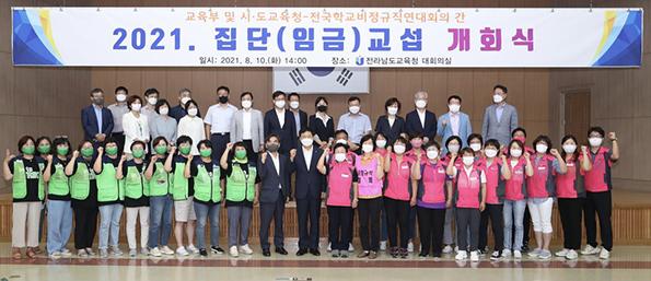교육부 및 17개 시·도교육청(대표교육청 전남도교육청)과 전국학교비정규직연대회의가 10일 오후 2시 전남도교육청 대회의실에서 2021년도 집단(임금)교섭 개회식을 갖고 본격 교섭에 돌입했다.