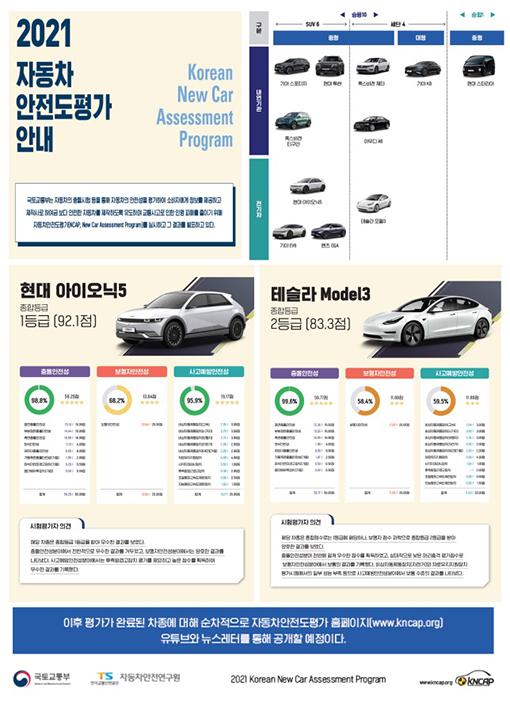 국토부는 한국교통안전공단 자동차안전연구원과 2021년 자동차안전도평가 대상 11개 차종 중 1차로 전기차 2종에 대해 평가한 결과 이 같이 나타났다고 17일 밝혔다.