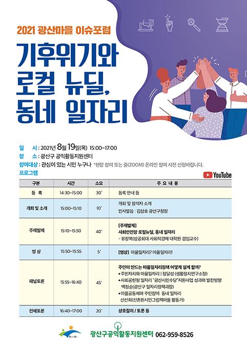 광산구가 기후위기, 감염병 등 각종 재난으로 심화되고 있는 불평등 문제에 대응하기 위한 방안을 찾기 위해 19일 오후 3시 광산구공익활동지원센터에서 ‘광산 마을 이슈 포럼’을 개최한다.