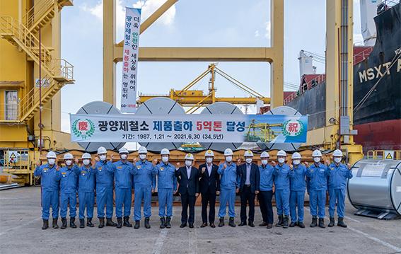 광양제철소는 지난 1987년 4월 첫 쇳물을 생산한 이후, 당해 5월 초도 출하 약 34년 만에 누적 제품 출하량 5억톤이라는 쾌거를 이루어냈다. 이를 길이로 환산할 경우 약 4430만km로, 지구 둘레를 1100여 바퀴 감을 수 있는 수준이다.