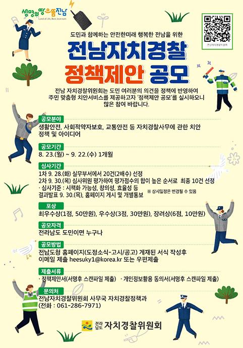 전남자치경찰위원회는 도민 의견을 반영한 지역 맞춤형 치안서비스를 제공하기 위해 9월22일까지 1개월 간 정책 제안을 공모한다고 24일 밝혔다.