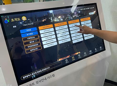 특히 동구청 현관 입구에 설치된 비대면 스마트 청사 안내시스템은 터치식 스크린을 통해 ▲각 부서별 업무 내용 ▲담당 직원 정보 ▲층별 부서 위치를 확인할 수 있다.