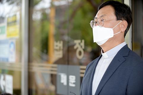 고 조비오 신부의 명예를 훼손한 혐의로 기소돼 1심에서 유죄를 선고받은 전두환씨 항소심 4번째 재판이 열린 30일 오전 광주법원 입구에서 조영대 신부가 취재진의 질문에 답하고 있다. 2021.08.30.