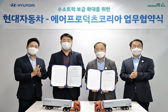유원하 현대차 국내사업본부장은 이날 체결식에서 "글로벌 산업용 가스 제조·판매 기업인 에어프로덕츠 코리아와 수소상용차 보급 확대를 위한 양해각서를 체결하게 돼 기쁘다"며 "양사 간 협력이 지속되고 수소 밸류 체인 활성화의 계기가 되기를 기원한다"고 말했다.