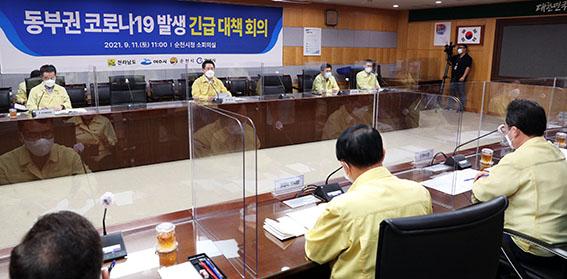 김영록 전남도지사는 지난 11일 순천시청 소회의실에서 ‘동부권 코로나19 긴급 대책 회의’를 열어 최근 확산세가 지속되는 동부권의 코로나19 방역 대응체계를 다잡았다.