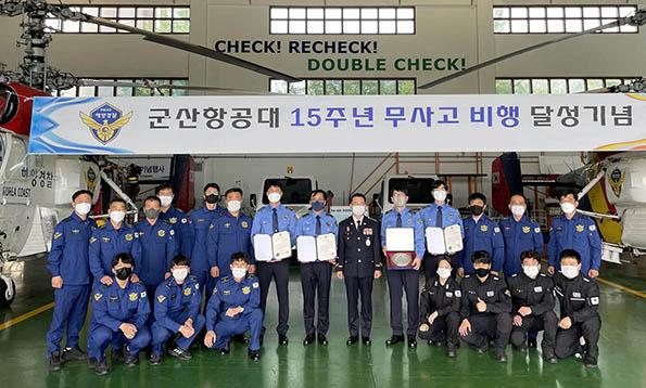 서해지방해양경찰청은 군산회전익항공대가 13일 항공대 계류장에서 '15년 무사고 비행 달성' 기념식을 가졌다고 밝혔다.