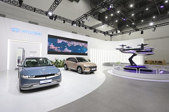 현대차는 미래 모빌리티 기술력을 보여주는 UAM 1:3 축소형 모델과 대표 친환경차 모델인 아이오닉 5, 넥쏘 등으로 전시 공간을 구성했다.