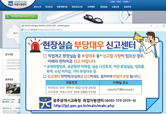 이에 따라 현재 실습 중인 현장실습생 보호의 시급성을 고려해 광주시교육청 취업지원센터(대면, 홈페이지 및 유선)에 현장실습 부당대우 신고센터(062-570-2970)를 긴급히 설치했다.