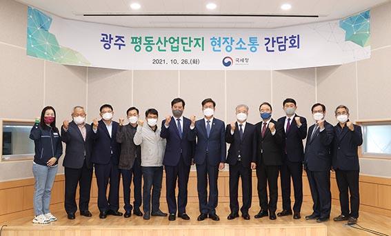김대지 국세청장(왼쪽에서 7번째)이 26일 광주 광산구 평동일반산업단지를 찾아 자동차 부품·금형·표면 처리 분야 등 뿌리 산업 중소기업 대표 10명과 현장 소통 간담회를 열었다. 2021.10.26. (사진=국세청 제공)