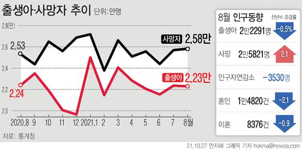 통계청이 27일 공개한 '2021년 8월 인구 동향'에 따르면 같은 달 출생아 수는 2만2291명으로 전년(2만2402명) 대비 0.5% 감소했다. 반면 사망자 수는 2만5821명으로 전년(2만5289명) 대비 2.1% 증가했다. 이에 따라 자연 증가(출생아-사망자) 수는 마이너스(-) 3530명을 기록했다.