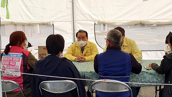 장 교육감은 27일 오전 교육청 앞 마당에 설치된 민주노총 광주본부 천막농성장을 찾아 학비노 진혜순 광주지부장을 만났다.
