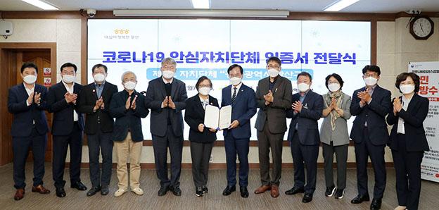 광산구는 1일 구청 2층 상황실에서 ‘코로나극복국민참여운동본부(이하 운동본부)’와 ‘안심 지방자치단체 인증서’ 전달식을 가졌다.